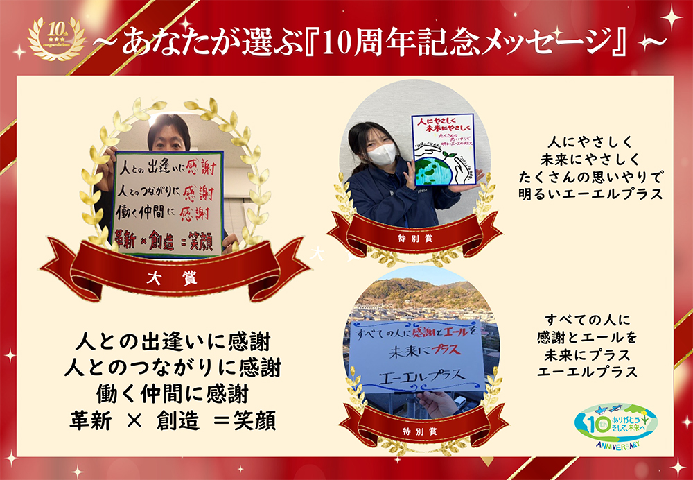 この記念すべき10周年にあたり、従業員の皆さんから「これまで」と「これから」への思いをこめたメッセージを募集したところ、120名・73点の心温まるメッセージが寄せられました。その言葉には、会社への愛着、仲間への感謝、そして未来への希望が込められていました。